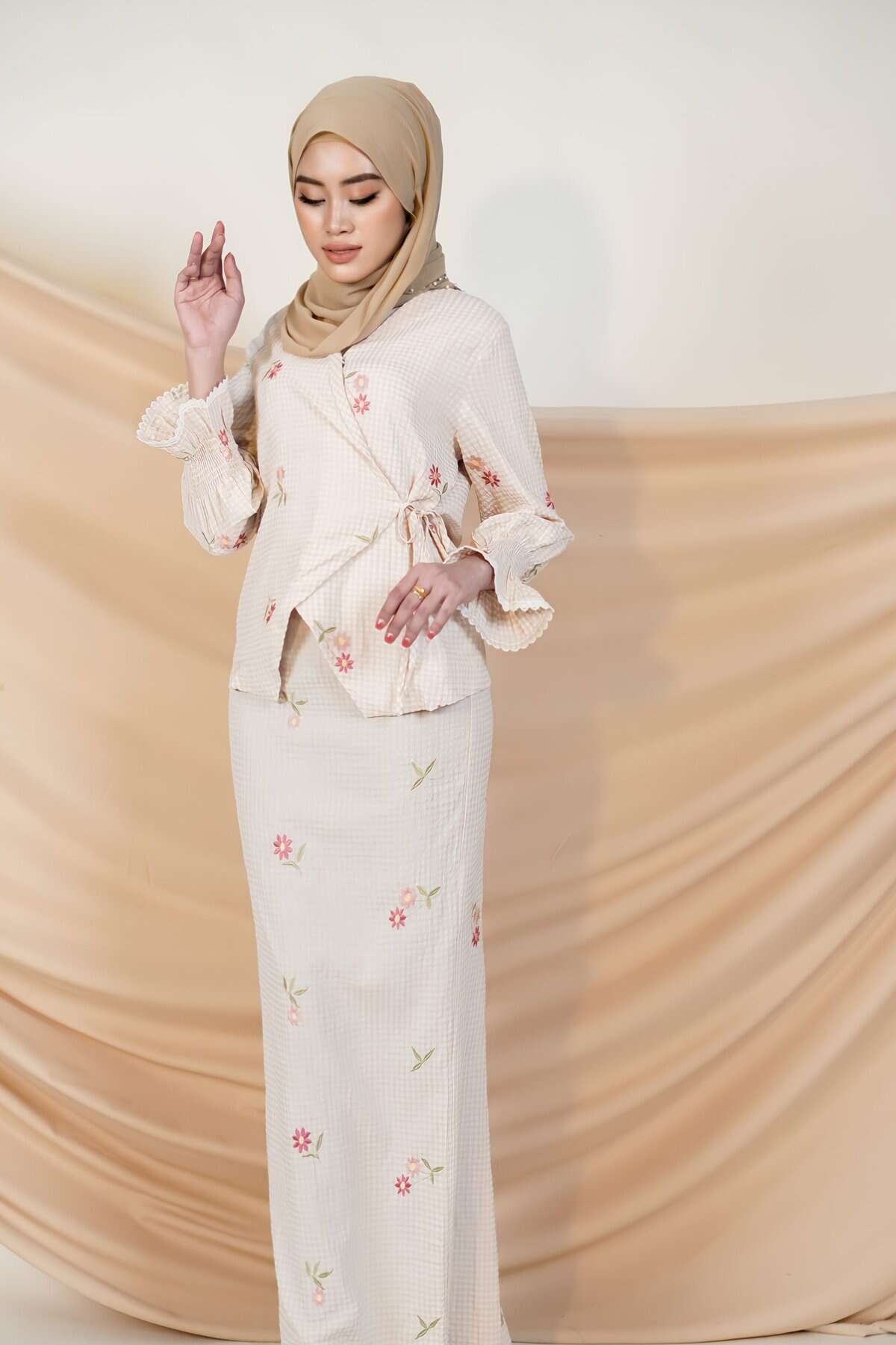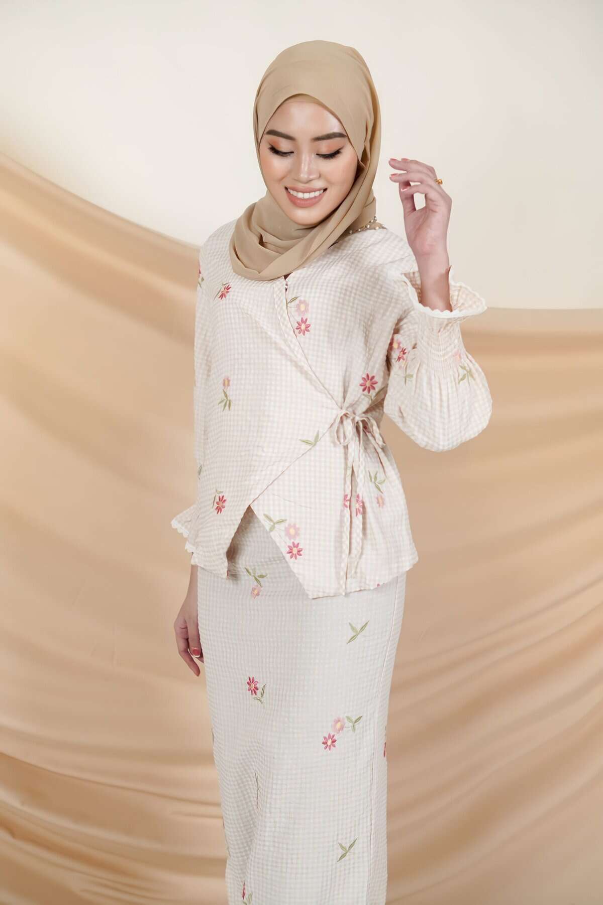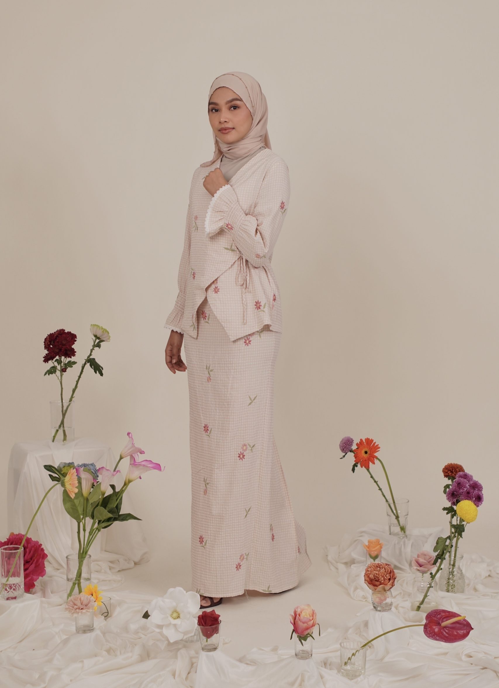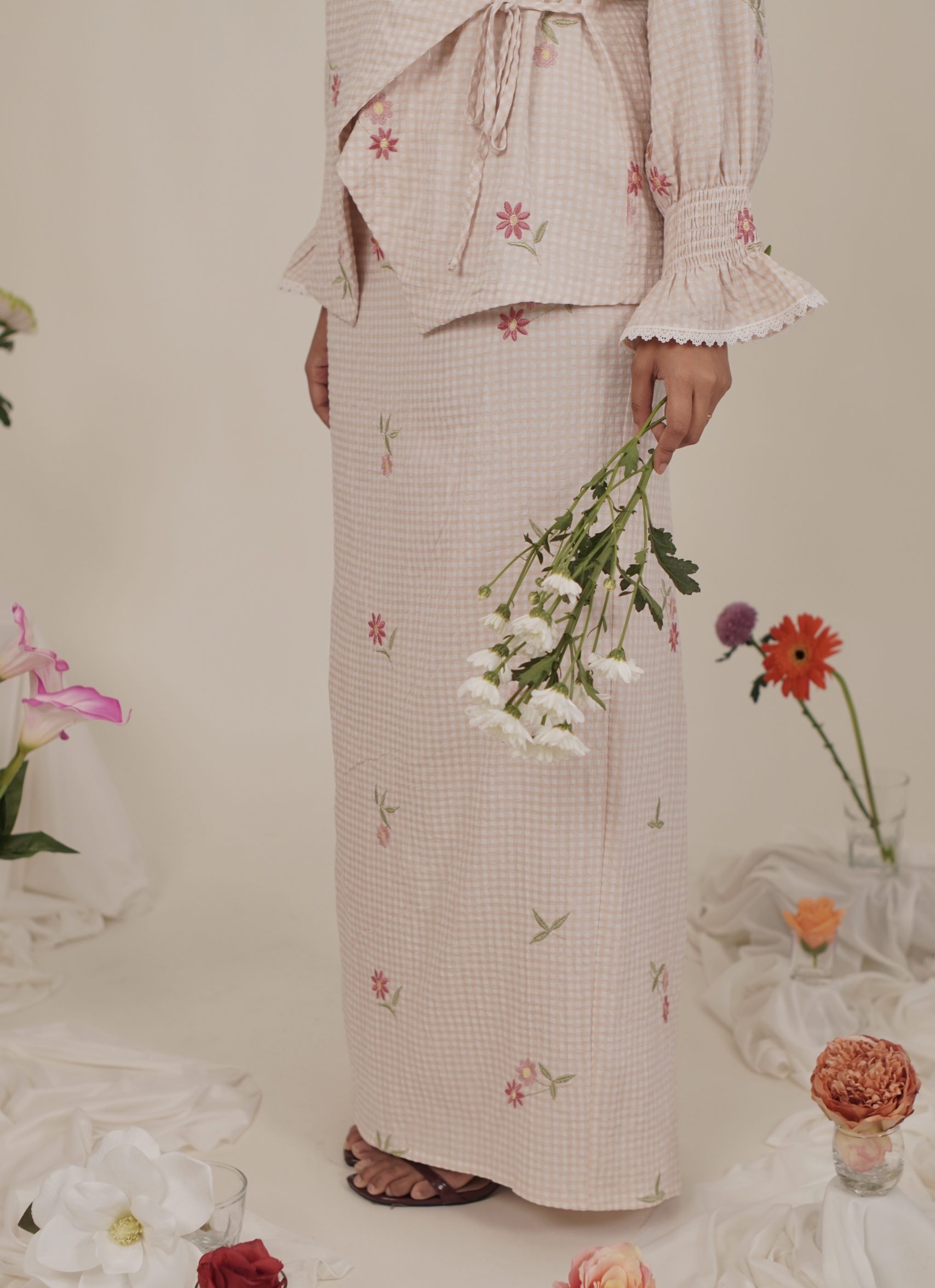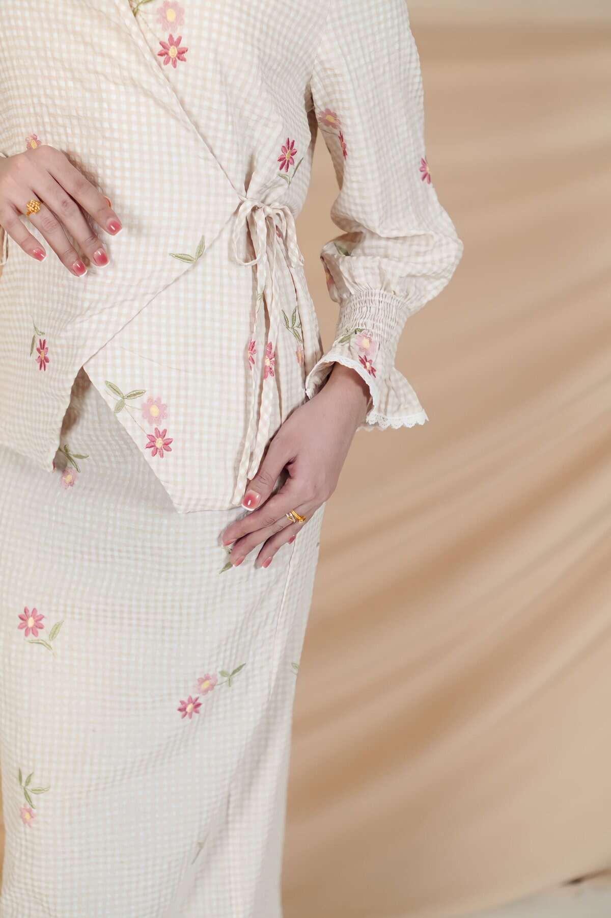 - Checkered pattern with embroidered floral