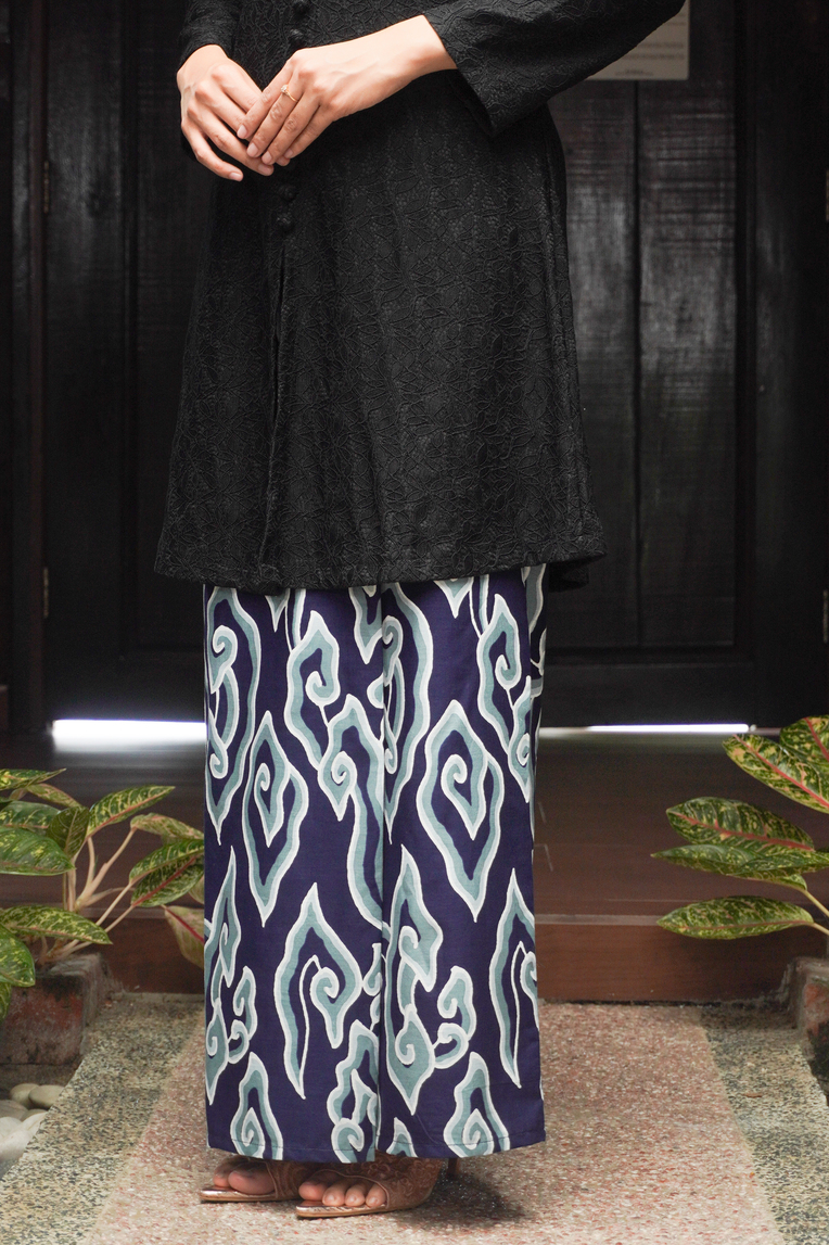 - Deep navy base highlighted with bold teal batik-inspired swirl motifs