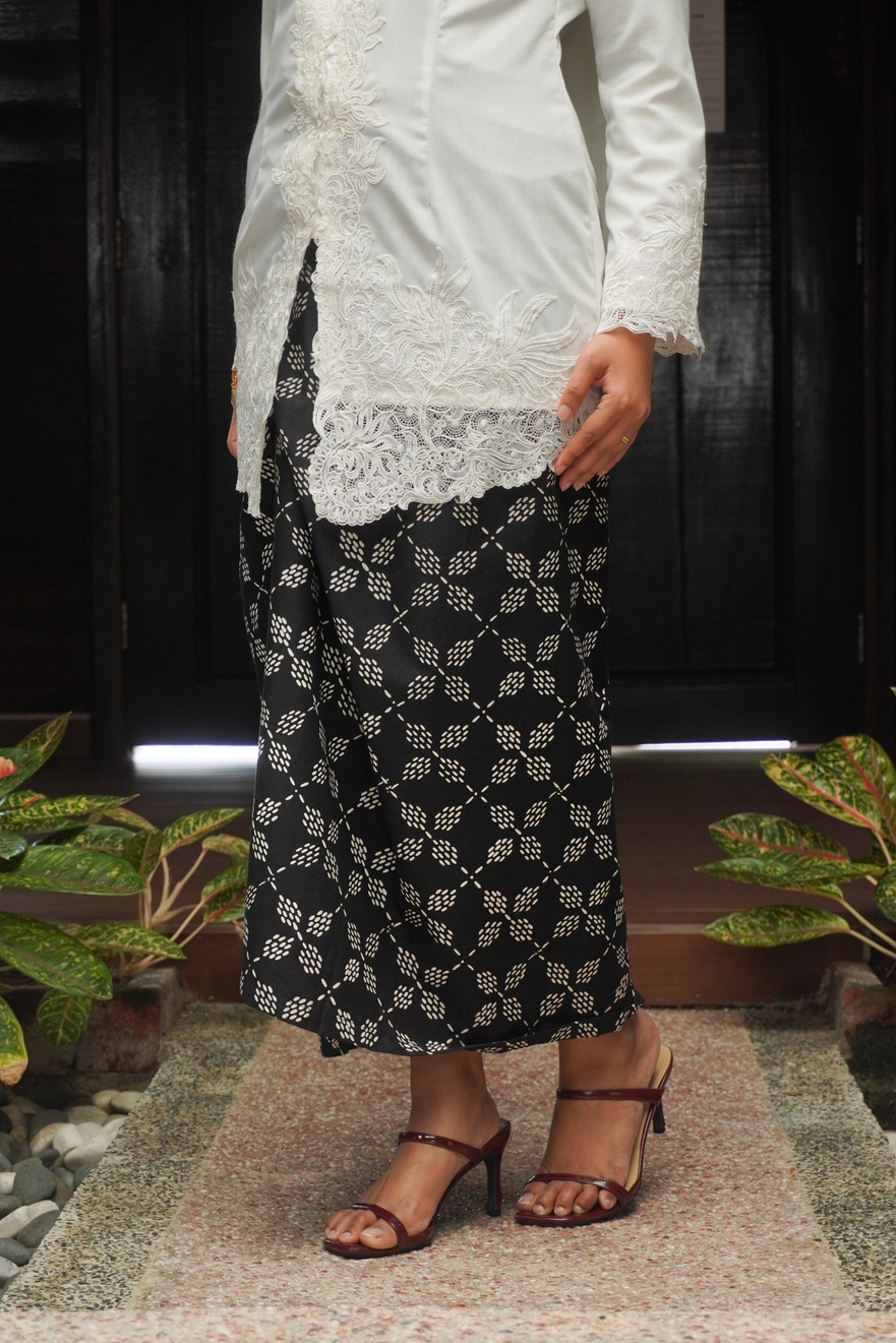 - Classic black base adorned with delicate white batik-inspired motifs