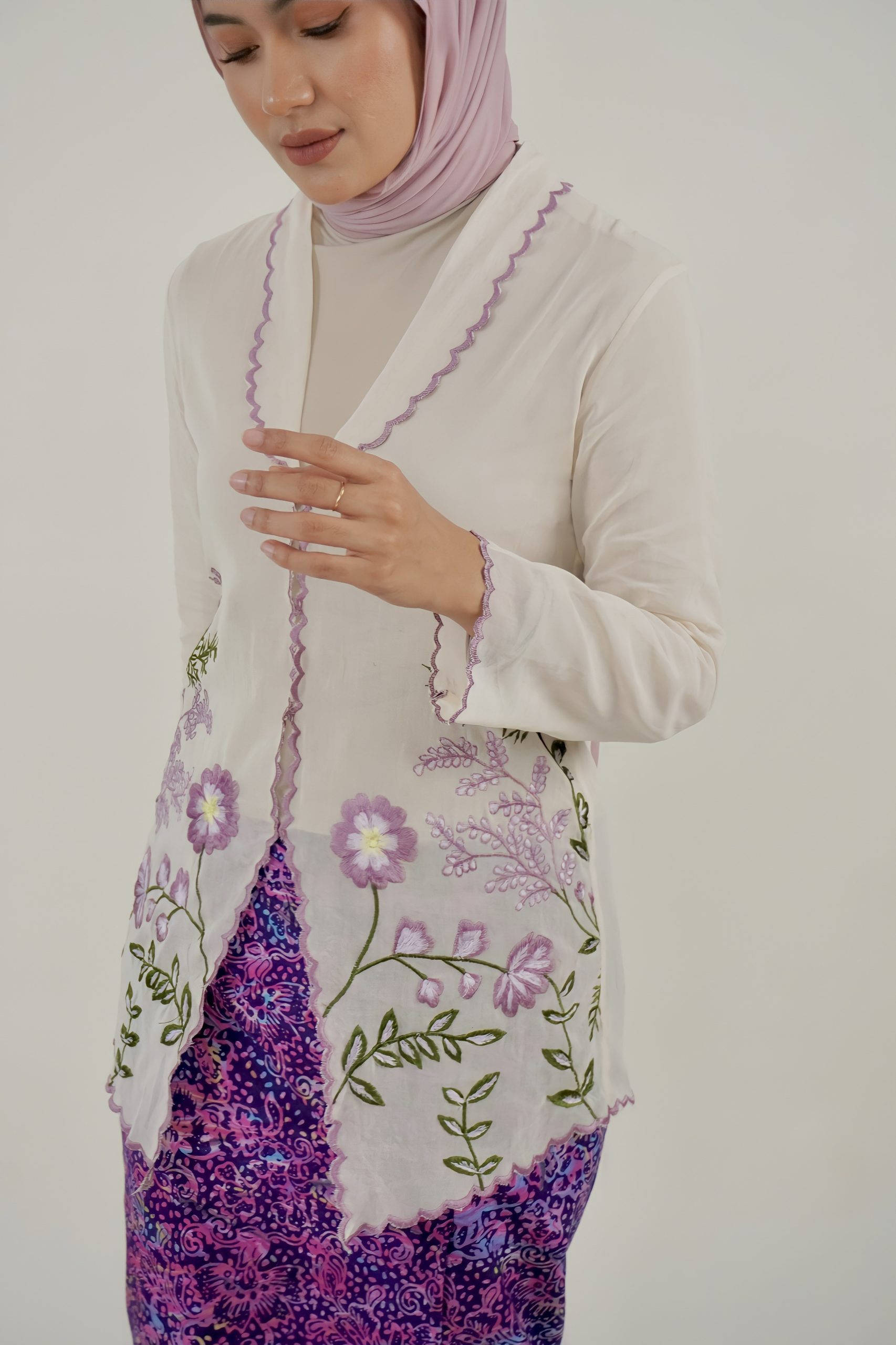 - Features a graceful ivory base adorned with beautifully embroidered floral motifs in soft lilac, blush purple, and fresh green, creating an elegant and feminine statement.